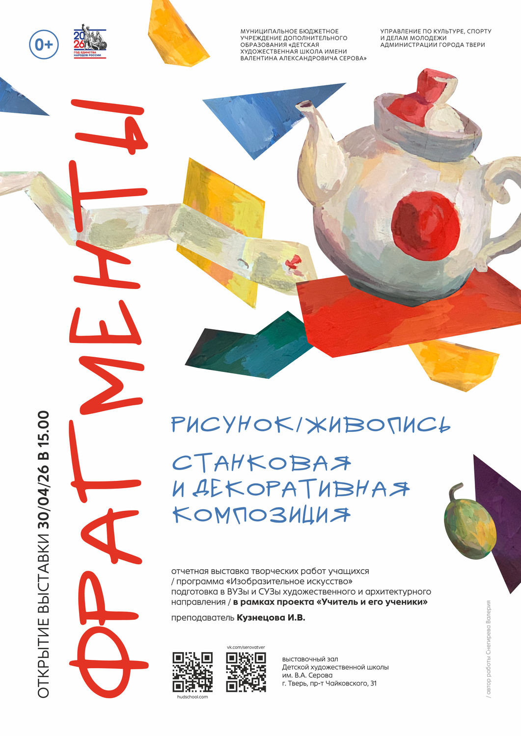 30 апреля 2026 года в выставочном зале МБУ ДО ДХШ В. А. Серова состоится открытие ежегодной отчетной выставки творческих работ учащихся группы подготовки в средние и высшие учебные заведения архитектурного и художественного направления МБУ ДО ДХШ имени В.А. Серова «Фрагменты» преподавателя Кузнецовой И.В., которая проходит в рамках проекта «Учитель и его ученики».